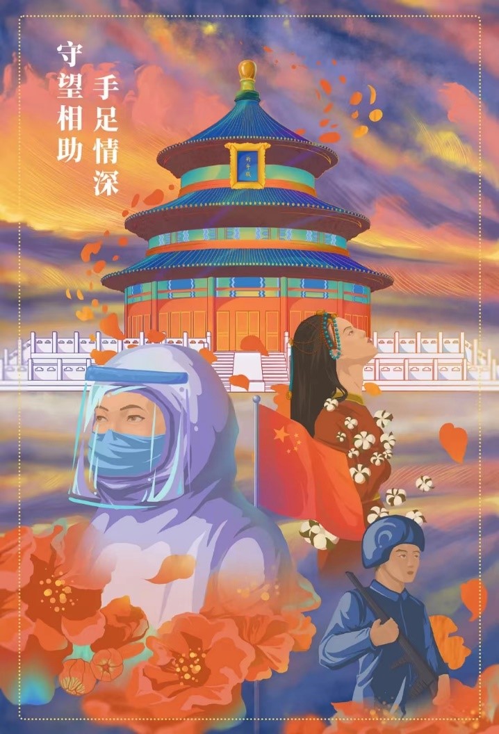 作品以绚丽的色彩为底色,以火红的石榴花衬托军、民、医三种形象。身着防护服的医务人员、着民族服饰的女性和持枪的卫士,由石榴花簇拥,眼神坚定,目视前方,背靠国旗,寓意我国各族人民团结一心,战胜一切艰难险阻,走向绚丽辉煌的明天。