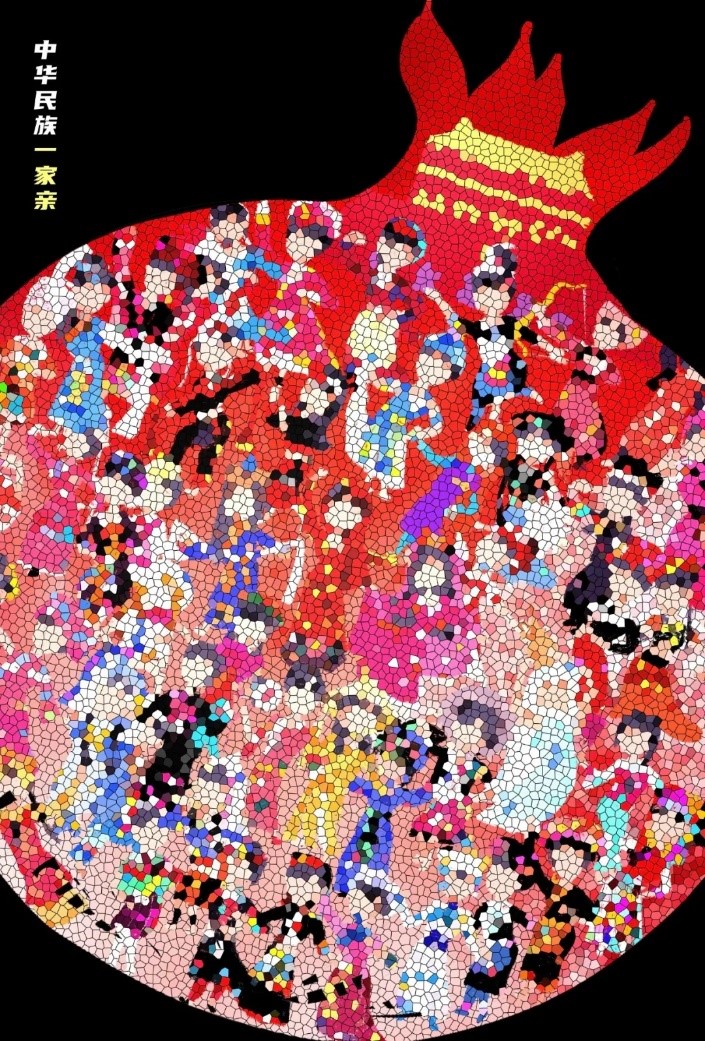 作品用象征民族团结的石榴果和由石榴籽组成、在天安门前翩翩起舞的各民族人物形象,寓意首都各族群众团结和睦、亲如一家。