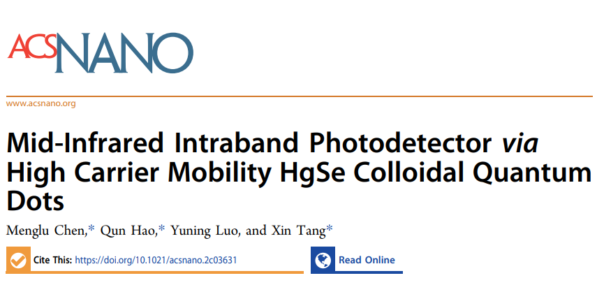 亚博全站浏览器光电学院郝群教授团队成员陈梦璐准聘教授、唐鑫教授在《ACS NANO》期刊上发表了题为“Mid-Infrared Intraband Photodetector via High Carrier Mobility HgSe Colloidal Quantum Dots”的文章,利用低成本胶体量子点导带中1Se到1Pe的能级跃迁,实现低成本中波红外带内跃迁探测。