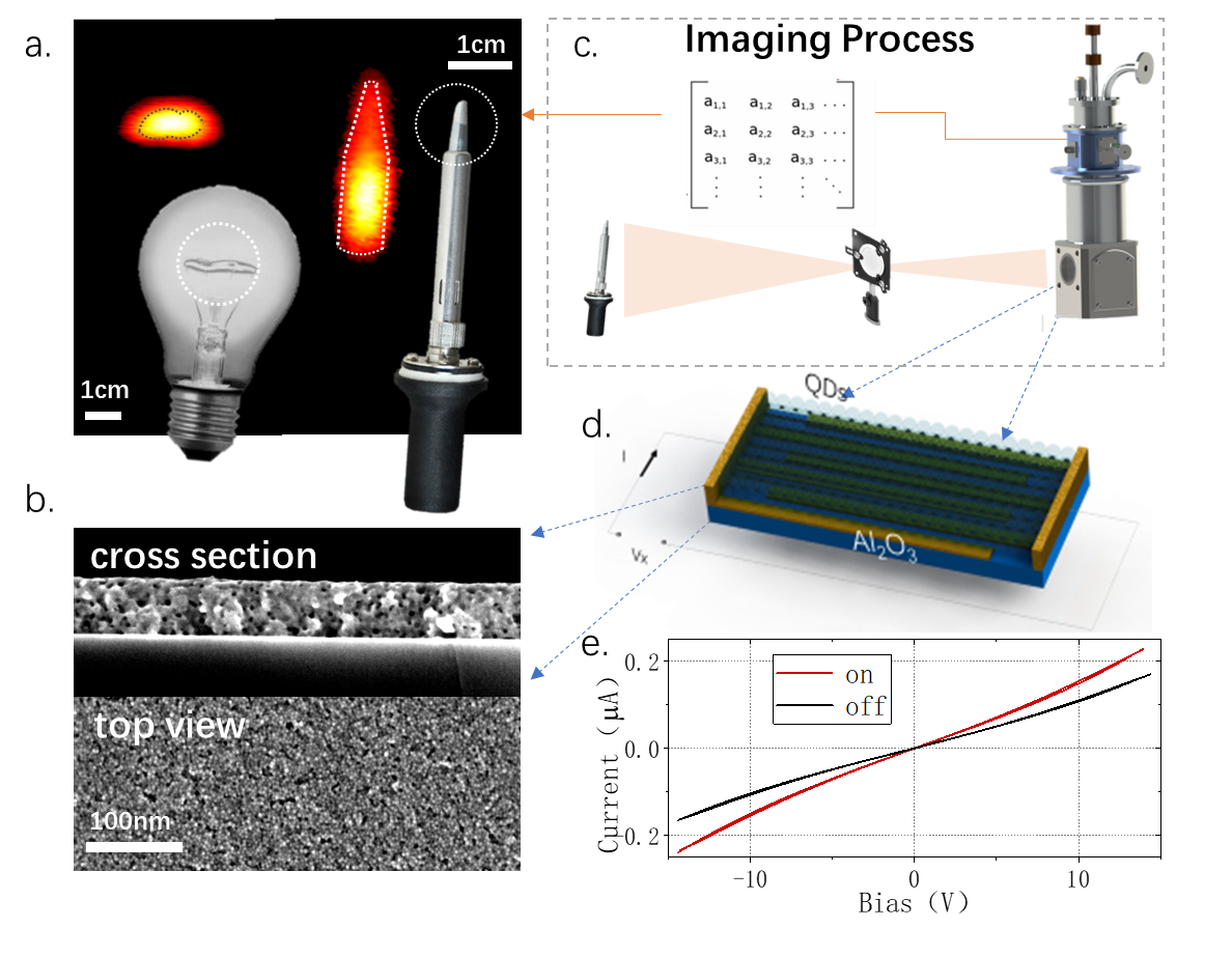 红外材料和器件的研究是红外技术发展的核心,实现低成本高性能的红外探测器是该领域的未来发展方向。然而由于光电效应限制,红外材料受限于窄带半导体材料。利用材料的带内跃迁可以突破红外光电材料对带隙的限制,极大拓宽红外材料的选择范围、丰富红外材料的制备方法,是降低红外材料于器件成本的有效路径之一。该工作利用胶体量子点液相合成与加工的优势,开发了室温混相配体交换的方法,在量子限域效应下实现高载流子迁移率(~1 cm2/Vs)及导带内掺杂的精确调控,使带内跃迁中红外光电探测器在响应速度上提升1000倍(达到数微秒量级),响应度提升55倍.在黑体辐射下,中波5微米比探测率大于1.7×109 Jones,首次获得了基于带内跃迁胶体量子点红外相机的热成像,并实现了探测精度0.25 ppm至2000 ppm的CO2气体传感器。