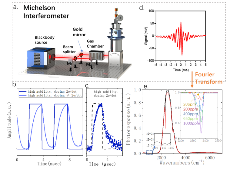 由此制备而成了胶体量子点带内跃迁红外相机,并成功实现热成像(图3)。与低迁移率的带内跃迁胶体量子点探测器相比,该探测器响应度提升了55倍,比探测率提升了10倍至1.7×109 Jones。并且可以实现数微秒的快速响应(图4)。其中波窄带探测、响应速度快的特点,可以实现对温室气体的灵敏探测。以CO2为例,结合迈克尔逊干涉仪, 本文成功结合实现了探测精度0.25 ppm至2000 ppm的CO2气体传感器。