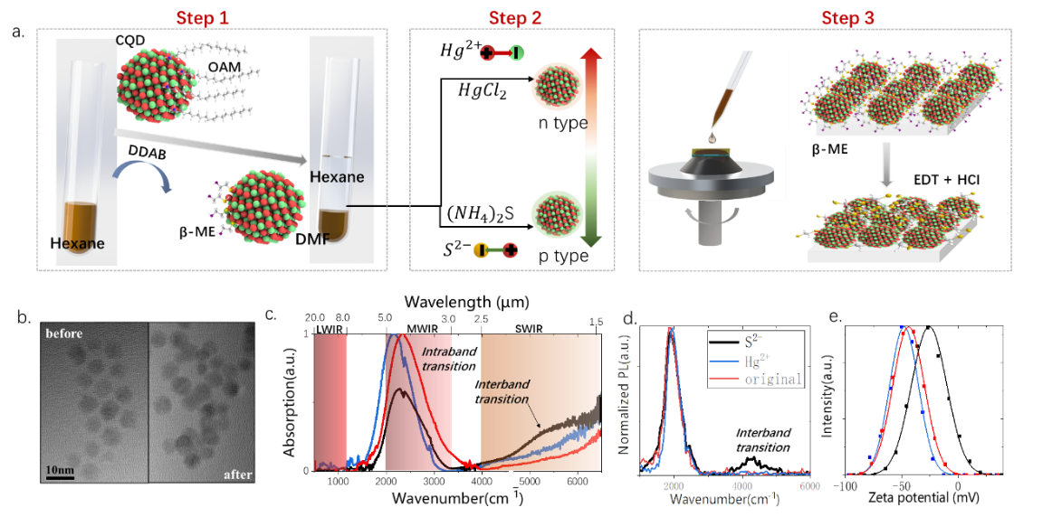 带内跃迁红外材料体系,对掺杂精确调控和载流子输运控制提出了更高的要求。该工作开发了带内跃迁胶体量子点混相配体交换方法(图1),可以有效减小量子点之间的间距,实现表面偶极子掺杂精确调控,并且使得材料在空气环境下稳定。并且搭建了光谱电化学平台(图2),获得精确的HgSe胶体量子点能带结构,证明材料中无明显缺陷态。