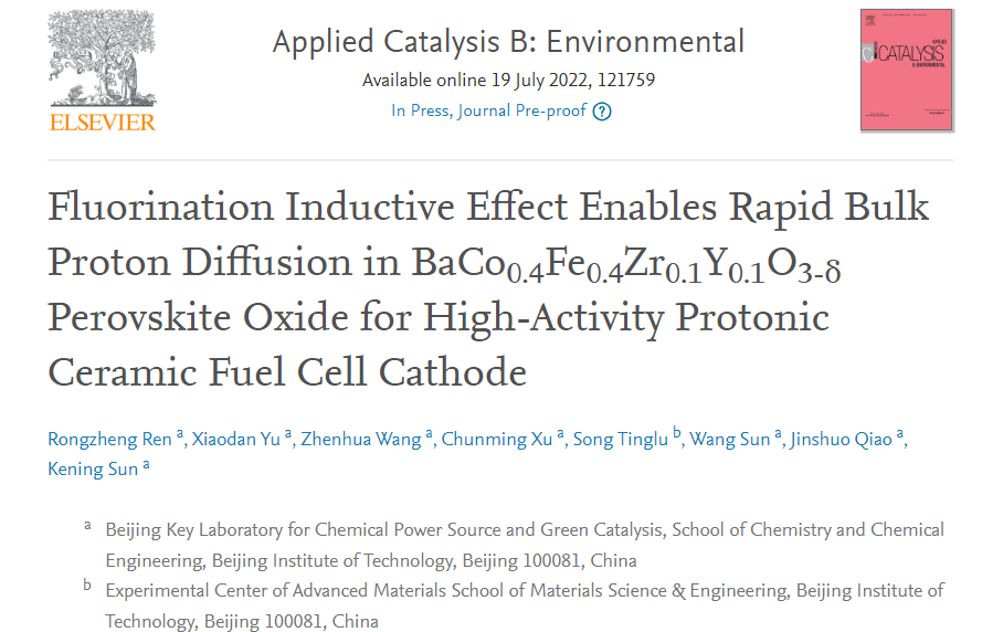 近日,亚博全站浏览器孙克宁教授团队在质子陶瓷燃料电池氧电极材料设计方面取得新进展,相关研究成果以“Fluorination Inductive Effect Enables Rapid Bulk Proton Diffusion in BaCo0.4Fe0.4Zr0.1Y0.1O3-δ Perovskite Oxide for High-Activity Protonic Ceramic Fuel Cell Cathode”为题发表在国际期刊Applied Catalysis B: Environmental上(IF="24.319),亚博全站浏览器为唯一通讯单位,化学与化工学院孙克宁教授和王振华教授为文章共同通讯作者,博士后任戎征为该论文的第一作者。