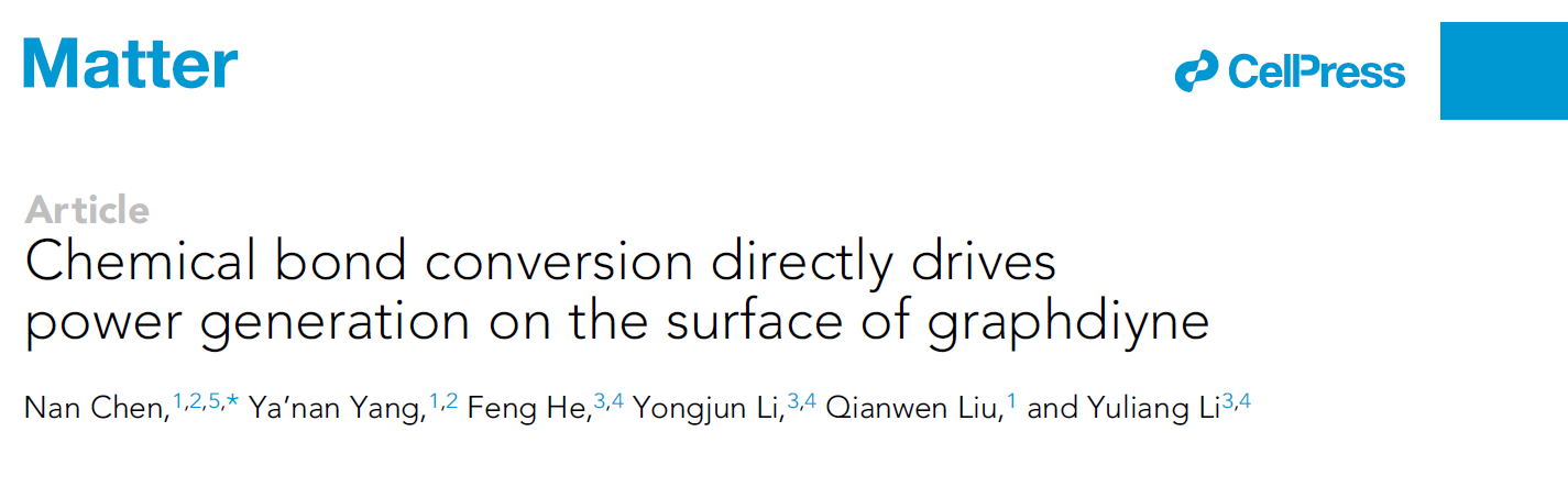 GDY中具有特殊分子结构和化学键的产电现象的发现,为能量形态变化的发展开辟了新的方向,促进了新能源的开发和实践。此外,感应电在未来有潜力用作能量转换和电能储存,以及用于快速检测和识别特定系统中的某些小分子。这一重要的研究成果以“Chemical bond conversion directly drives power generation on the surface of graphdiyne”为题发表在《物质》期刊上( Matter , 2022, DOI: 10.1016/j.matt.2022.06.045)。本工作得到了国家自然科学基金、北京市自然科学基金、亚博全站浏览器创新人才科技资助专项计划(青拔)等多个项目的资助。文章的第一和通讯作者是陈南副教授,第一单位为亚博全站浏览器。