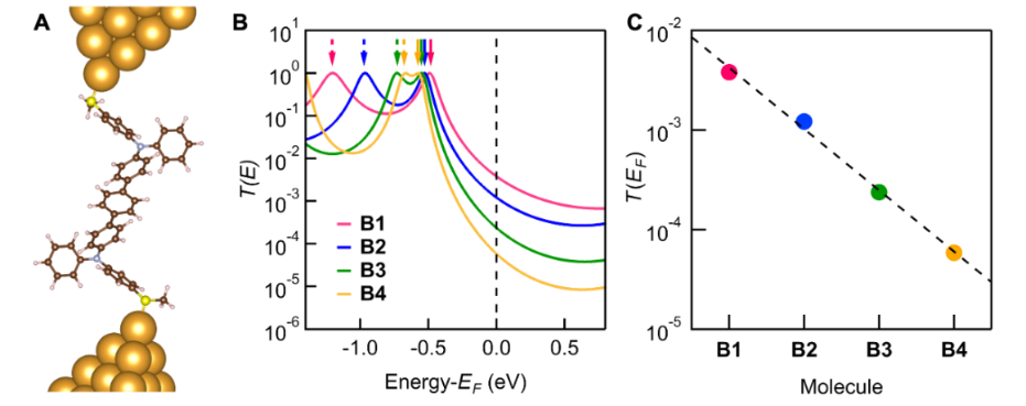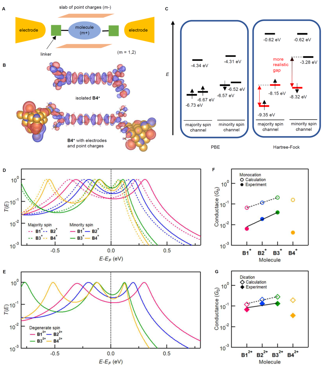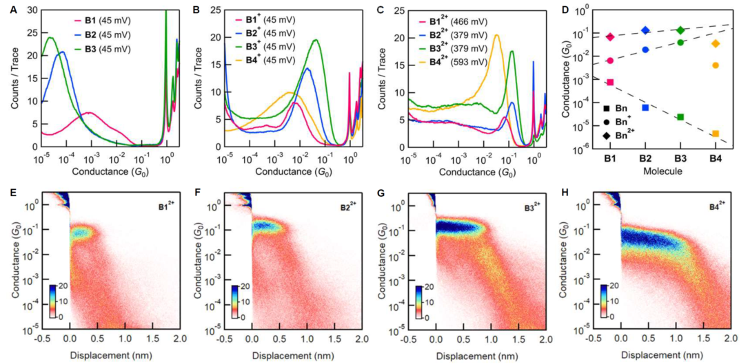研究人员基于STM-BJ测试平台系统研究了该类分子导线在不同氧化态的单分子电导性质。其中,B32+分子导线显示出明显高于 0.1 G0 (2e2/h, 电导量子)的超高电导率,相比其中性分子高 5400 倍,且分子导线长度达到2.6 nm。研究人员也观察到氧化后的阳离子型分子导线呈现电导与导线长度的负相关特征,分别为b(B1-3+)="-0.9/苯;b(B1-32+)=-0.3/苯,表明该类分子导线具有SSH模型描述的一维拓扑绝缘体特征。此外,研究人员也观察到了B4分子导线在氧化之后并没有延续前三个分子导线的电导趋势,而是表现出了明显的下降,这也说明了基于SSH模型的分子导线电导性质与长度有较强的相关性。